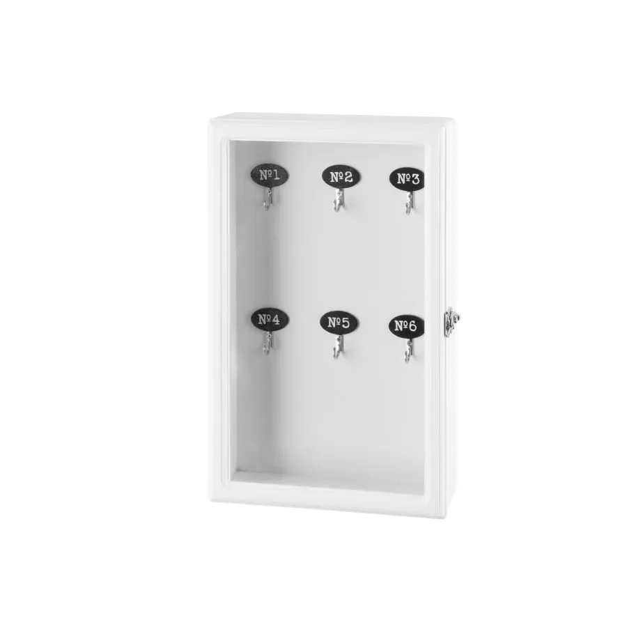 A stylish industrial-style key cabinet. 6 hooks inside the cabinet. Glass door.