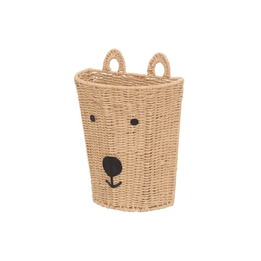 A cute Teddy Bear basket can be hung on the wall. Made of paper twinw. A iron wire frame gives the basket some posture and support. Maximum load 2 kg.