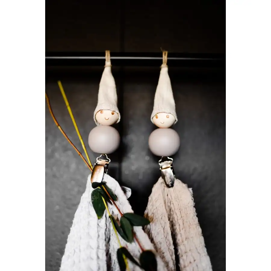 The Elf towel clip is made of two wooden beads and a metal clip that you can use to hang your bath and hand towels. Length 20 cm. Handmade in Finland