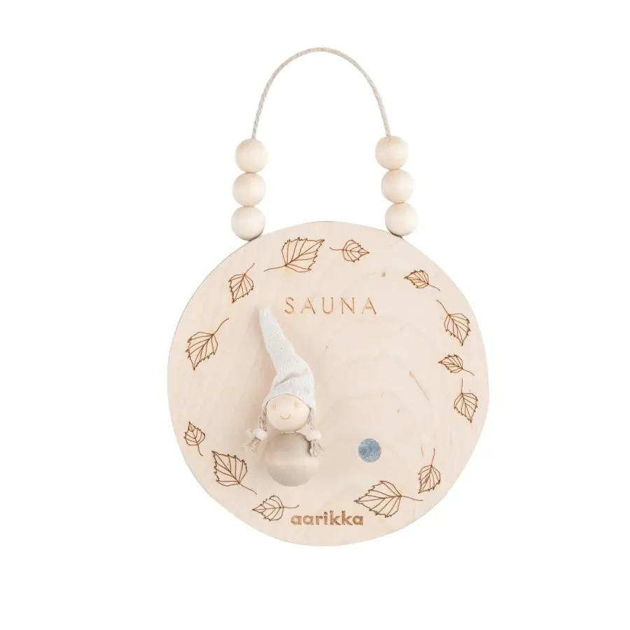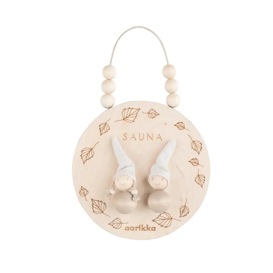 The Elf sauna sign is made of birch plywood and features detachable elves with a magnetic fastening mechanism.