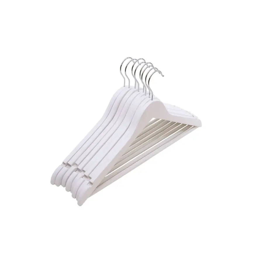 Klädhängare i trä med rund distans och kjolull. Kromad krok. Matt vit. Hängstorlek 45×1,2×23 cm.