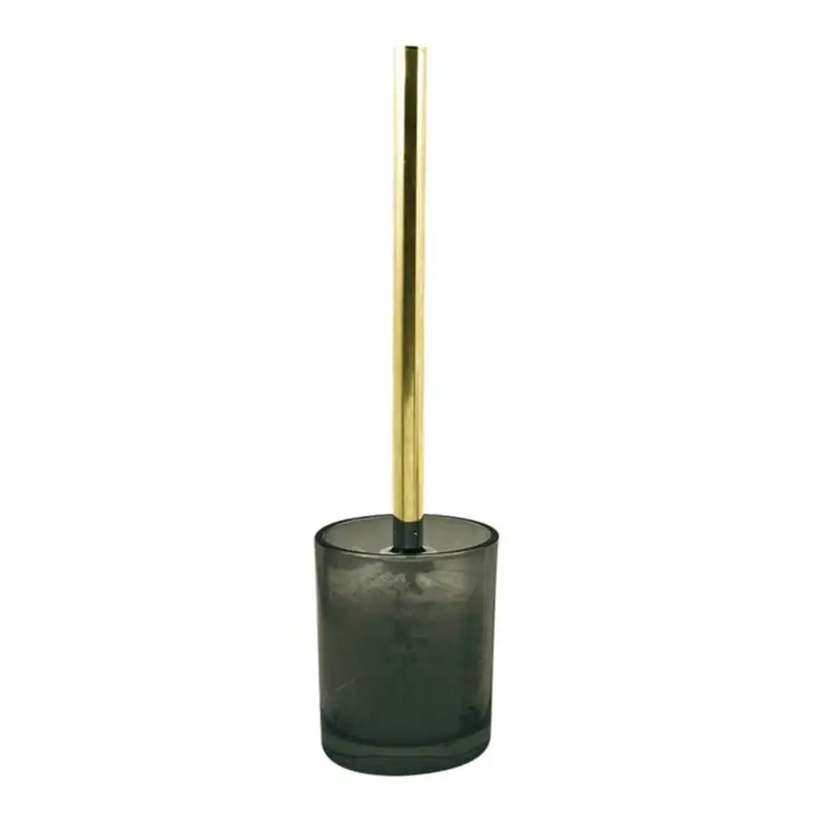 Dark gray glass toilet brush holder. Included is a brush with a gold-colored handle and a replaceable brush part. Size 11.6×36 cm.