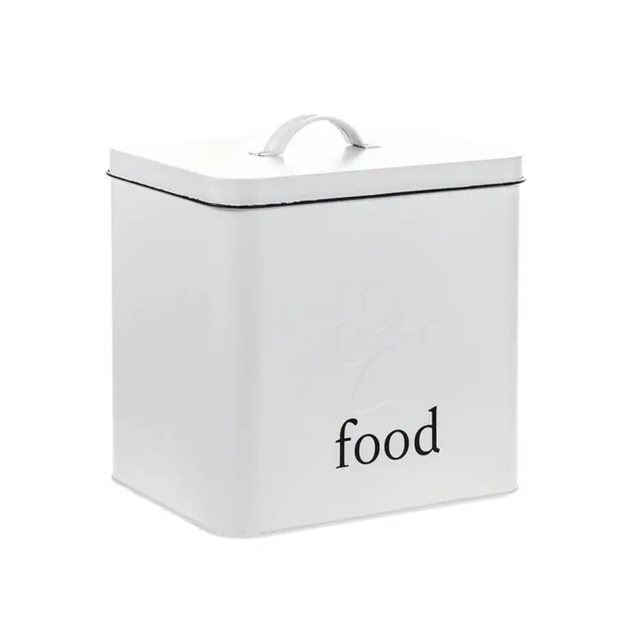 Vit husdjursmatburk med metalllock. Storlek 25,5×20,5x24cm.