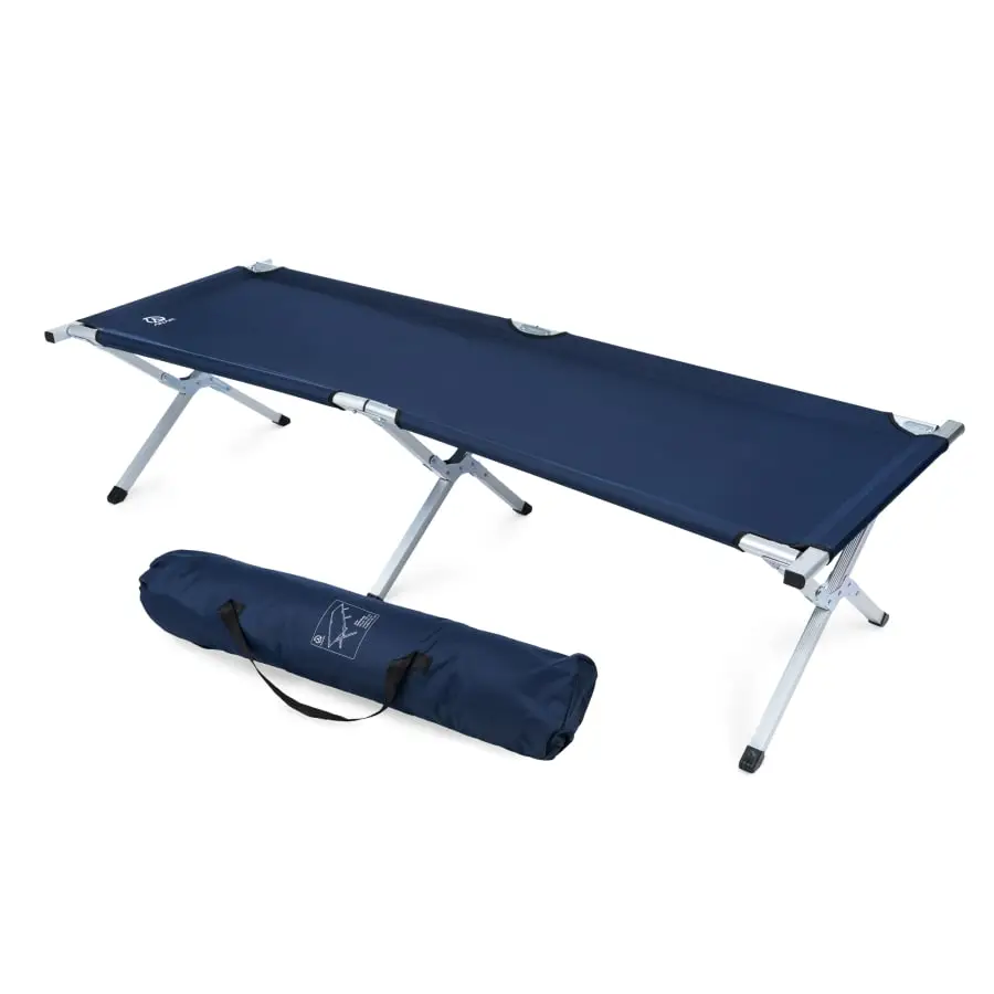 En enkel person, lättbyggd resesäng med ram i aluminium. Tack vare den vikbara ramen kan sängen placeras på ett litet utrymme och den kan bekvämt bäras med dig i en transportväska. Tygdel slitstark 600D polyester. Ett bra val för en resa, en stuga eller till och med som extrasäng hemma.