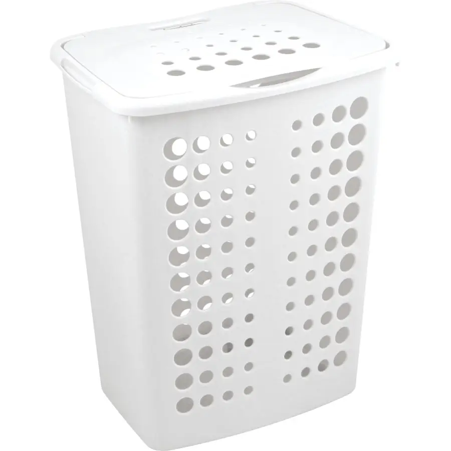 Curver laundry basket with lid. The basket has a perforated body and lid and is snow white in color. The lid is hinged.