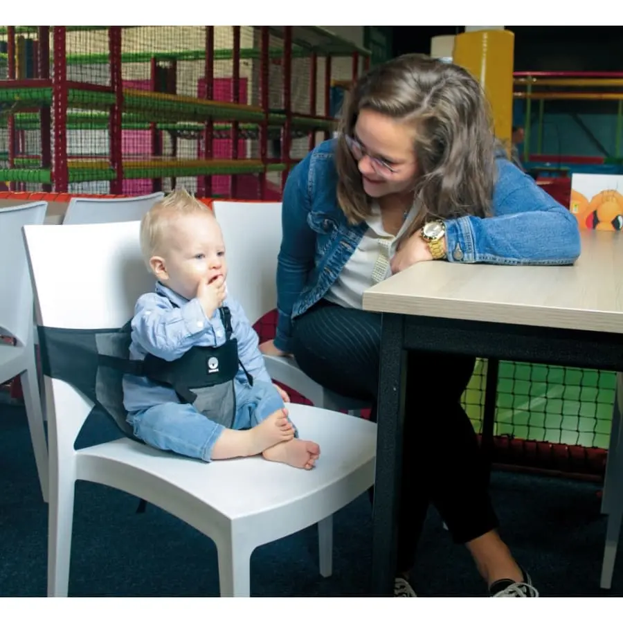 chair. 5-point harness secures the child to the chair. Universal, fits most chairs. Safe for your child. Compact, foldable. Material: polyester. Easy to clean. Colour: black/grey melange.