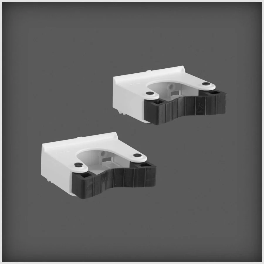 The Elfa tool holder is easily attached to the carrier rail without tools. You can attach e.g. brush, rake or mop. Two holders in the package. Suitable for Ø 30-40 mm products. Material plastic.
