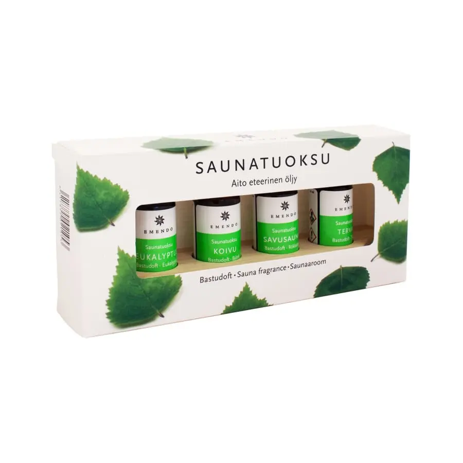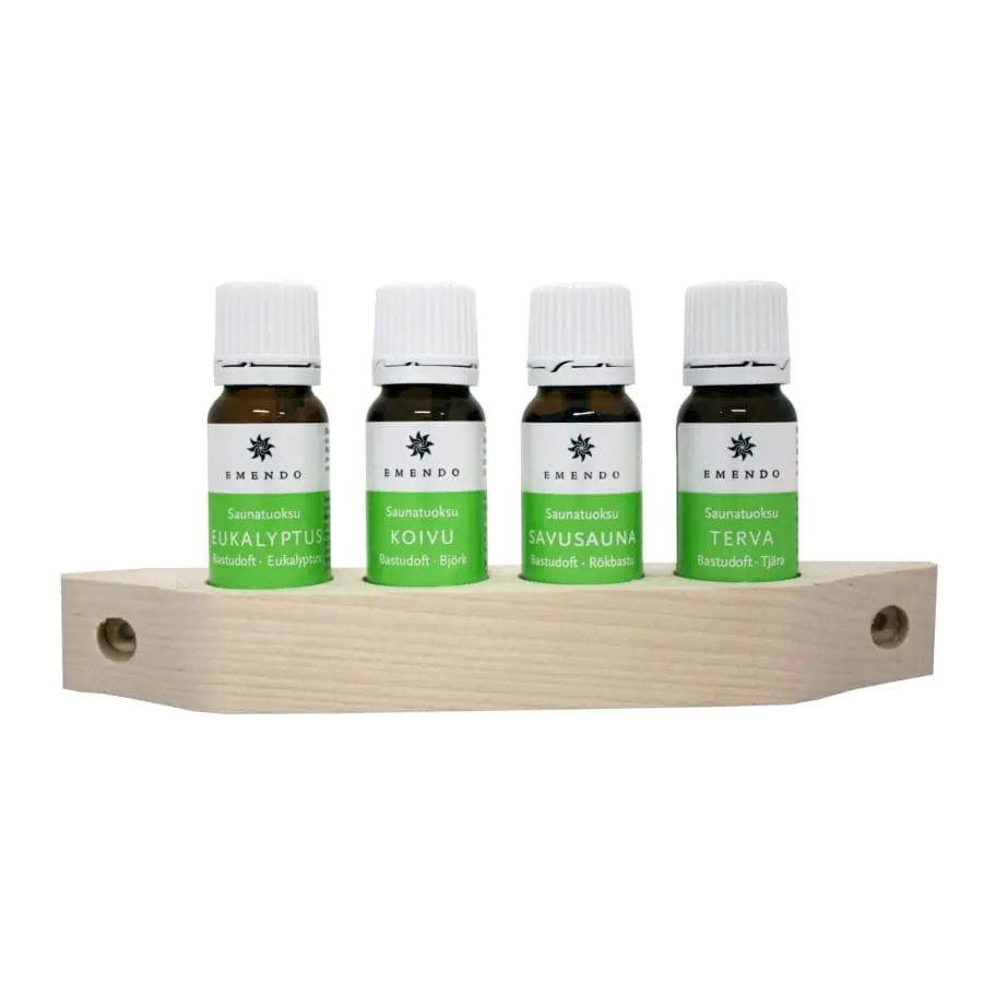 The wooden wallrack includes Eucalyptus, Birch, Smoke sauna and Tar fragrances 10 ml. Emendo sauna fragrances contain 100% essential oils and natural tar. Add 2-6 drops of sauna fragrance to a scoop of water, throw over the hot stones of the sauna stove and enjoy your fragrant, atmospheric sauna.