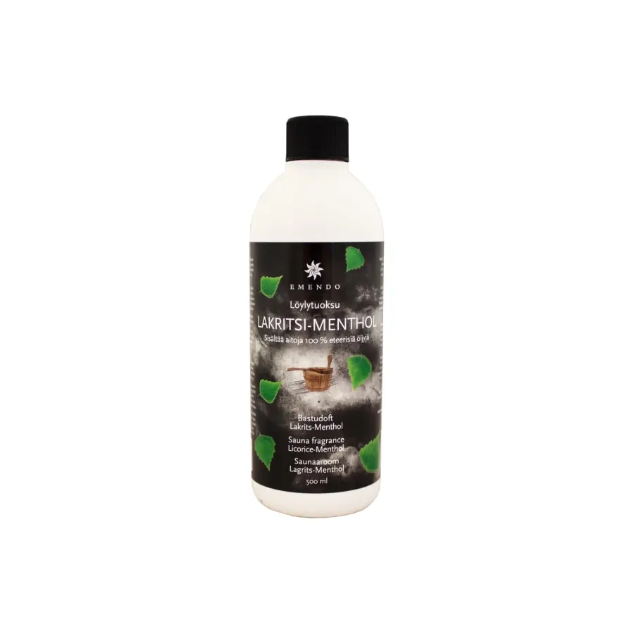 Licorice-menthol is a fresh sauna fragrance that adds a pleasant scent to the sauna and makes the sauna experience even more enjoyable. Contains menthol and 100 % essential oils. Does not contain synthetic parfumes. Add ½ dl of sauna fragrance to water ( 3 l), throw over the hot stones of the sauna stove, enjoy the aroma and relax.