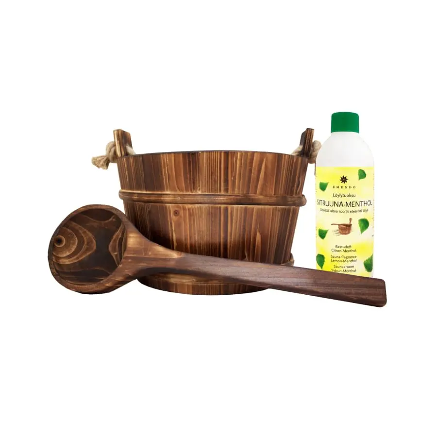 Set includes sauna bucket with rope, ladle and sauna fragrance Lemon-Menthol 500 ml. The sauna bucket has a plastic water basin inside.