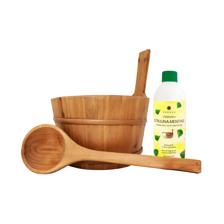 Stylish wooden funnel and ladle and Lemon-Menthol 500 ml sauna scent.