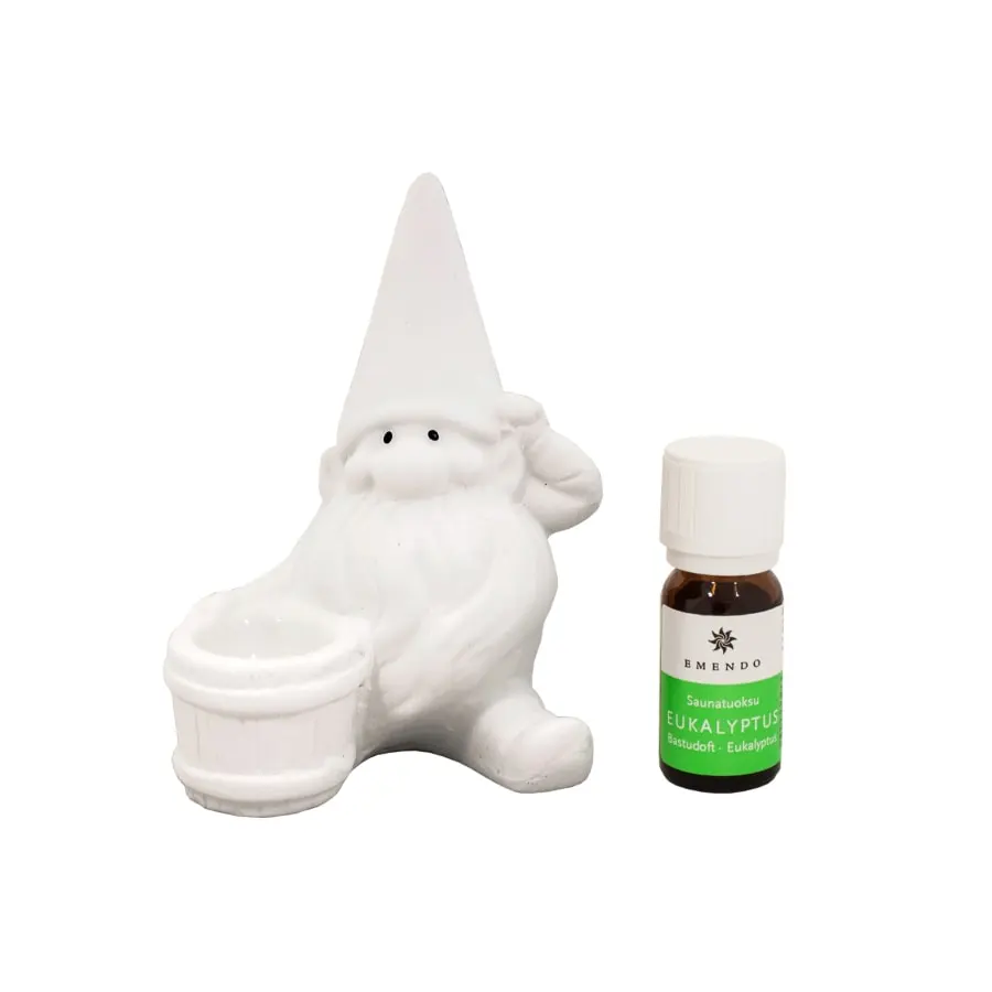 The sauna gnome brings a pleasant smell to the sauna and is a cool decoration at the same time. Place e.g. on the boards of the sauna or on the window. Drop 2-6 drops of sauna fragrance into the cup. In the heat of the sauna, the oil evaporates and spreads a good smell.