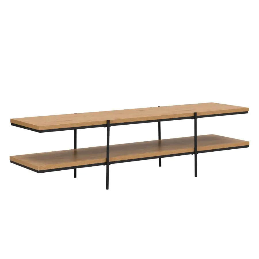 Straight-line TV stand. Black metal legs, oak-colored coated MDF shelves.