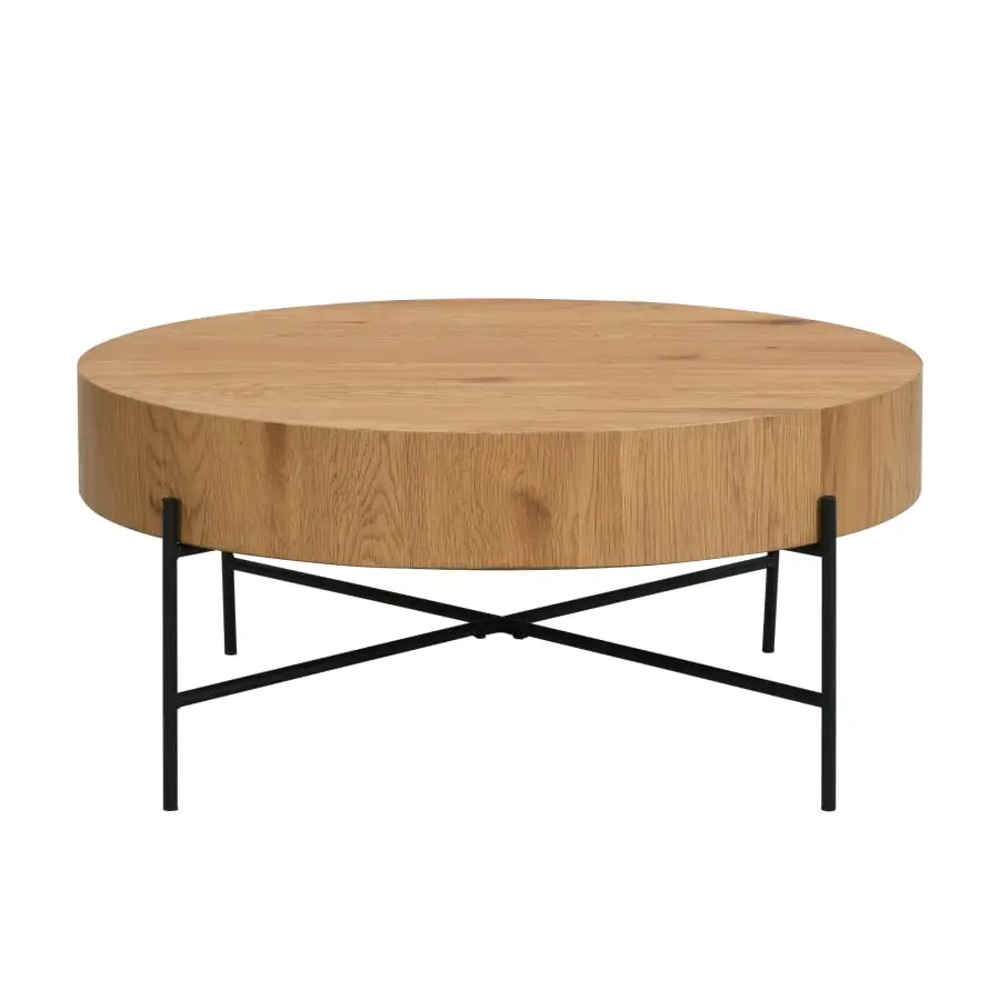 A stylish round coffee table with a thick cover and graceful black metal legs. Cover of coated MDF board.