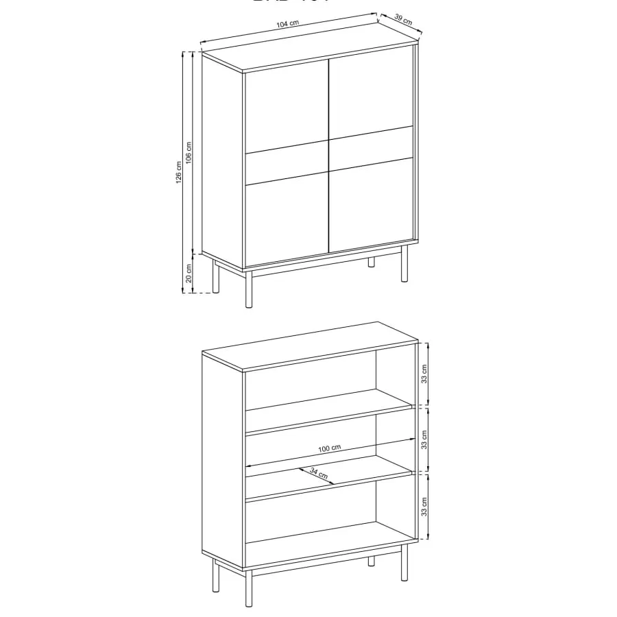 Stylish and modern Milo cabinet with plenty of storage space. The cabinet has an oak-colored 18 mm laminated furniture board frame, gray front sets, ABS edge strip and black painted wooden legs. The cabinet has two doors and two wide intermediate shelves inside the cabinet. The doors have a push-to-open mechanism. The width of the cabinet is 104 cm, depth 39 cm and height 126 cm. Delivery in parts.