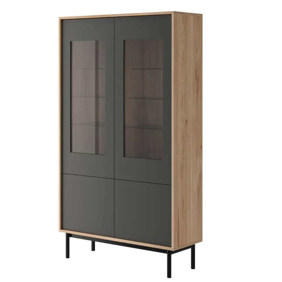 A stylish and modern Milo showcase with plenty of storage space. The display case has an oak-colored 18 mm laminated furniture board frame, gray front sets, ABS edge strip and black painted wooden legs. The showcase has two tempered glass doors with a push-to-open mechanism. In the upper part of the showcase there are three glass shelves on both sides of the partition, and in the lower part there are shelves on both sides of the partition. The display case is 104 cm wide, 39 cm deep and 185 cm high. Delivery in parts.