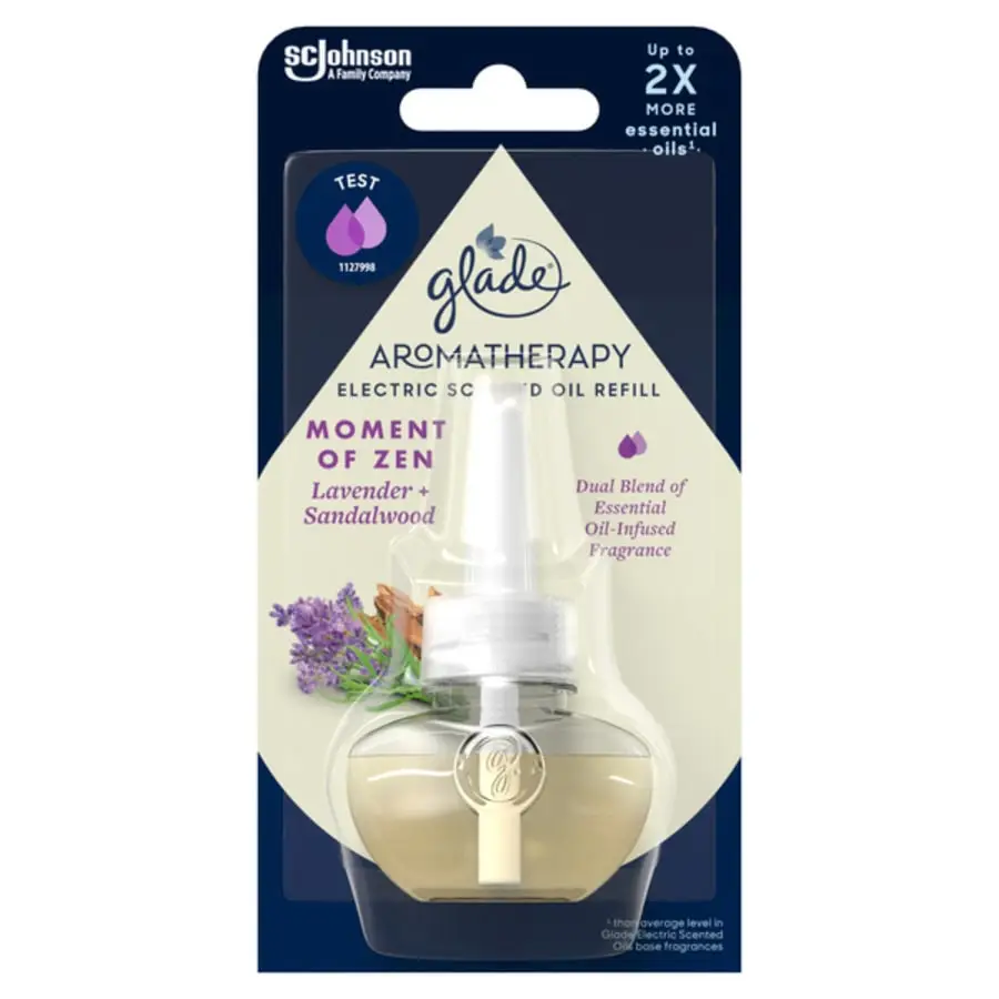 Refill forGlade Aromatherapy Liquid Electric electric air freshener. Consciously crafted fragrances infused with essential oils. Relaxing Moment of Zen consists of lavender and sandalwood.