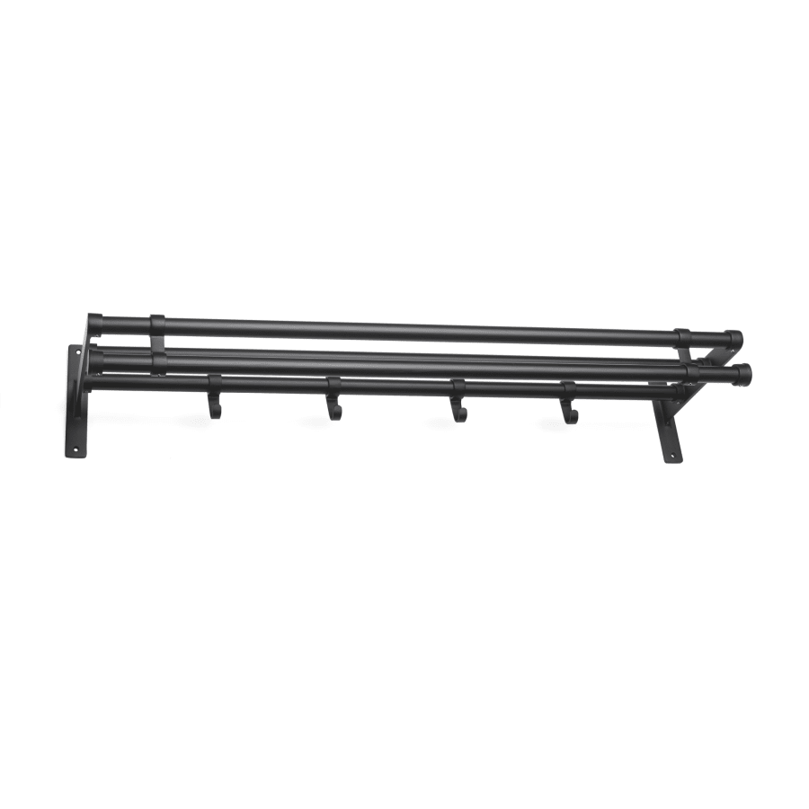 Stylish coat rack, ends and hooks made of aluminum. Plastic-coated steel pipes. Additional rod for clothes, designed for storing clothes, hats and shoes. Delivery in parts. Shelf width 1,000 mm and overhang 270 mm.