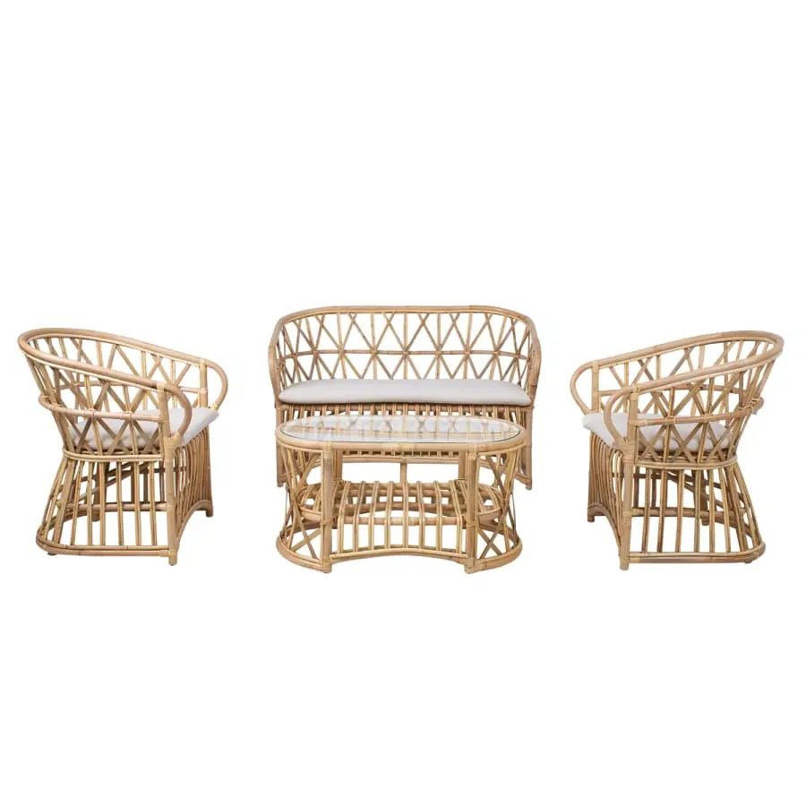 Fräscht soffset Acapulco i rotting, som innehåller en soffa, två fåtöljer och ett bord. Möbelns ram är gjord av rotting och bambu. Rottingytorna är avslutade med en vattenlöslig betslack. Soffbordsöverdrag 5mm klart härdat glas. Sittdynorna till soffan och fåtöljen ingår i paketet. Sittdynor av vitt polyestertyg. Rottingmöbler avsedda för inomhusbruk, men kan användas utomhus på en täckt altan eller balkong.