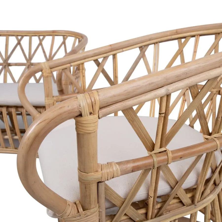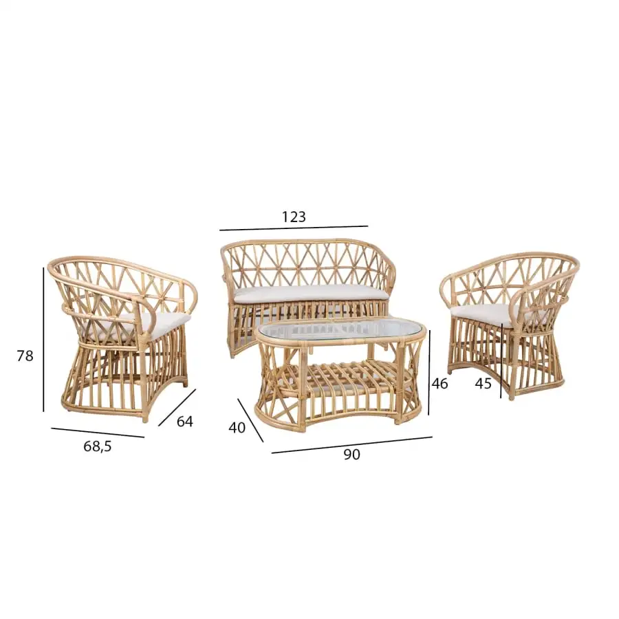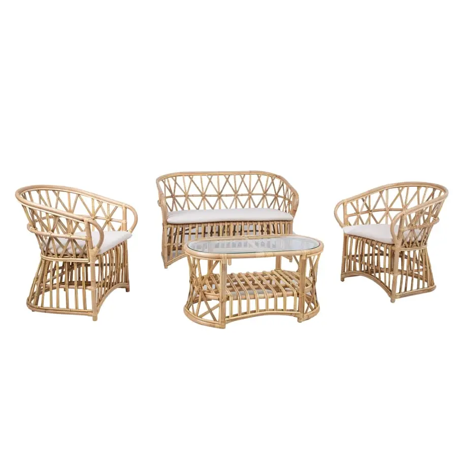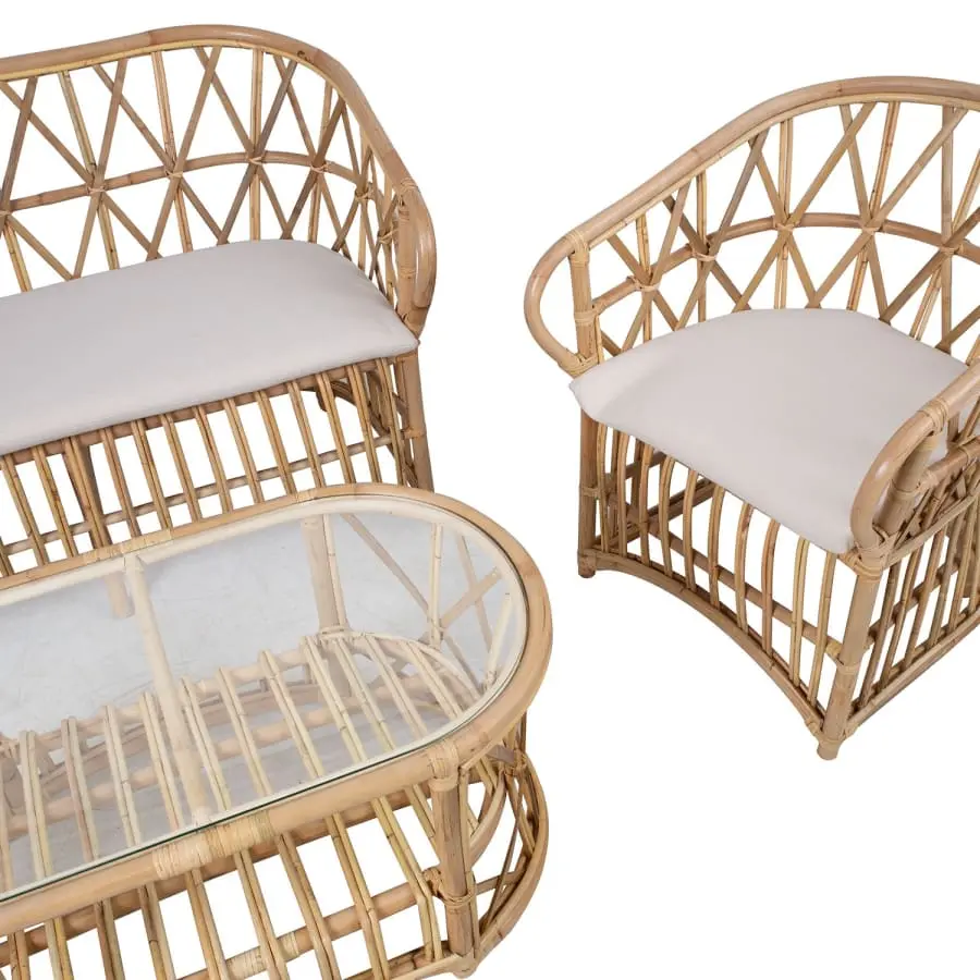 Fresh rattan sofa set Acapulco, which includes a sofa, two armchairs and a table. The frame of the furniture is made of rattan and bamboo. The rattan surfaces are finished with a water-soluble stain varnish. Coffee table cover 5mm clear tempered glass. The seat cushions for the sofa and armchair are included in the package. Seat cushions made of white polyester fabric. Rattan furniture intended for indoor use, but can be used outdoors on a covered terrace or balcony.