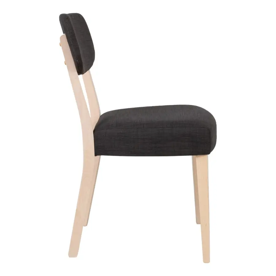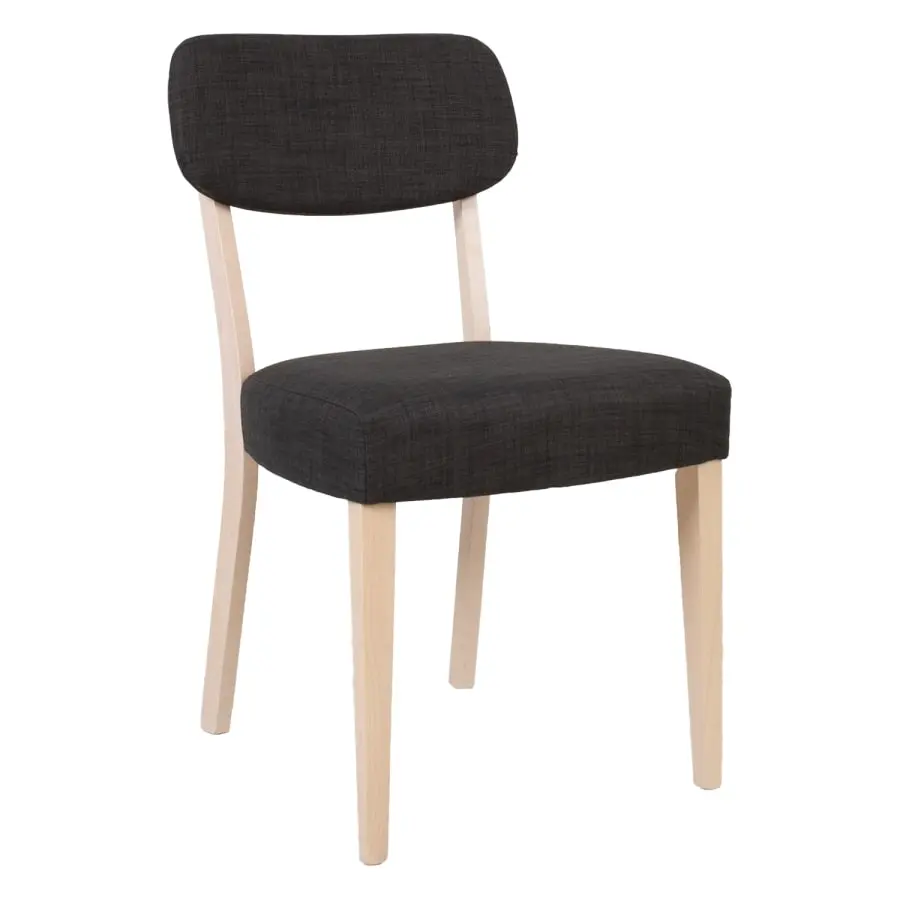 Snygg matstol Adora, vars sits och rygg är klädda i mörkgrått tyg. Benen och ramen är gjorda av bok. Trädelarna är avslutade med vitlack i nyansen av naturligt trä.