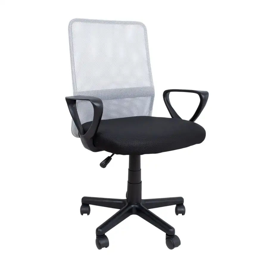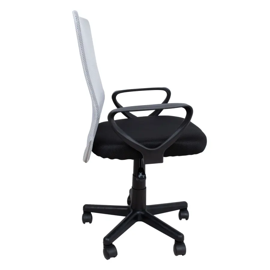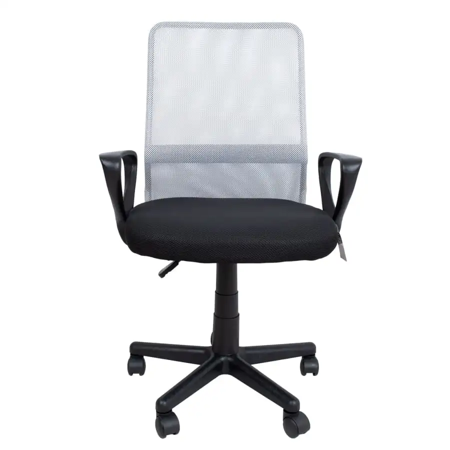 The slightly upholstered seat is covered with polyester fabric, the backrest with polyester mesh fabric. Pneumatic seat height adjustment. Black plastic armrests. Black 5-prong plastic stand, R27cm. The wheels are plastic, 50 mm.