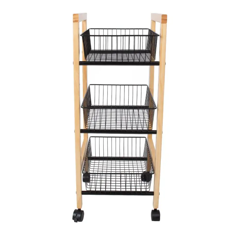 Shelf BREN. The practical triple shelf is well suited for storing items in the hall and in the storage or pantry. The shelf has wheels, so it is convenient to move it. The body of the product is made of solid pine and has a natural tone. The shelf’s three steel wire baskets are coated with powder paint.
