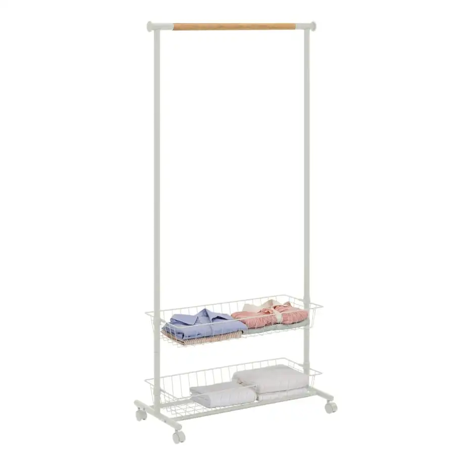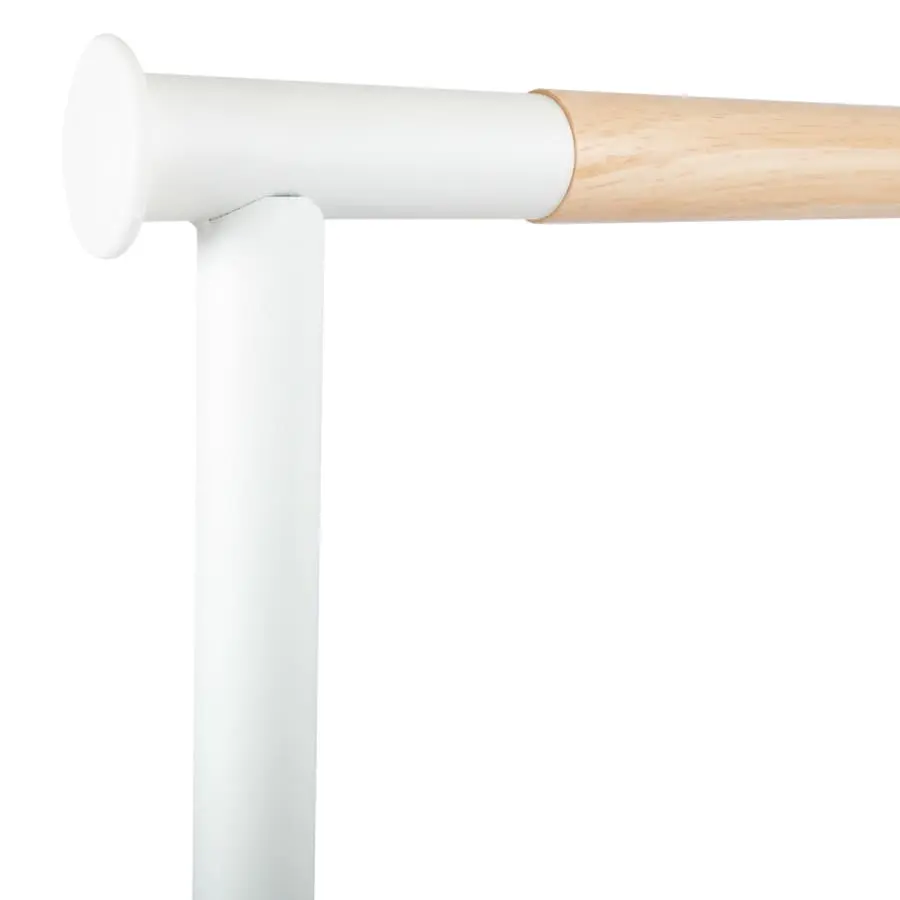 Sleigh BREN white. The practical rack is excellent for versatile storage of clothes. In the upper part of the sled there is a wooden hanger in a natural shade, which is easy to hang clothes on. In the lower part of the product, there are two steel wire baskets for storing other important items. The sled also has wheels, so it is easy to move. The steel frame and baskets are coated with white powder paint.