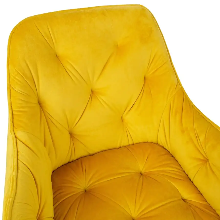 Stol BRITA 61x57x83cm, gul sammet. Den bekvämt formade sitsen är lätt klädd och klädd med gul sammetstyg. Sitsens höjd är 47,5 cm. Överdragsmaterial: 100 % polyester, Martindale 25 000. Sitsram: metall och plywood. Klädsel: polyuretanskum. Metallbenen är belagda med svart pulverfärg. Viktgräns 120 kg.