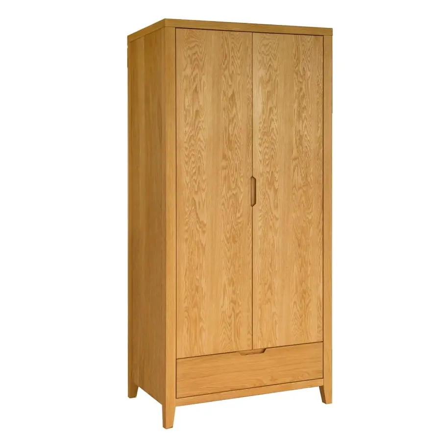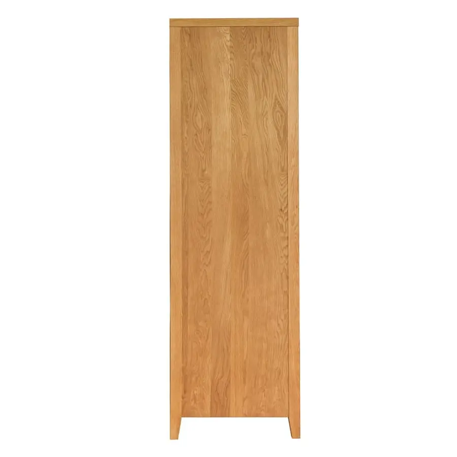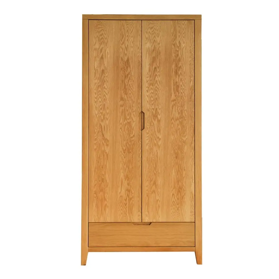 Wardrobe Chamba with beautiful oak veneer. The frame, top and front panels of the drawers are natural oak veneer. The middle shelf is plywood covered with oak veneer. Hanging rods and a long shelf in the left part of the cabinet. Three shelves in the right part of the cabinet.