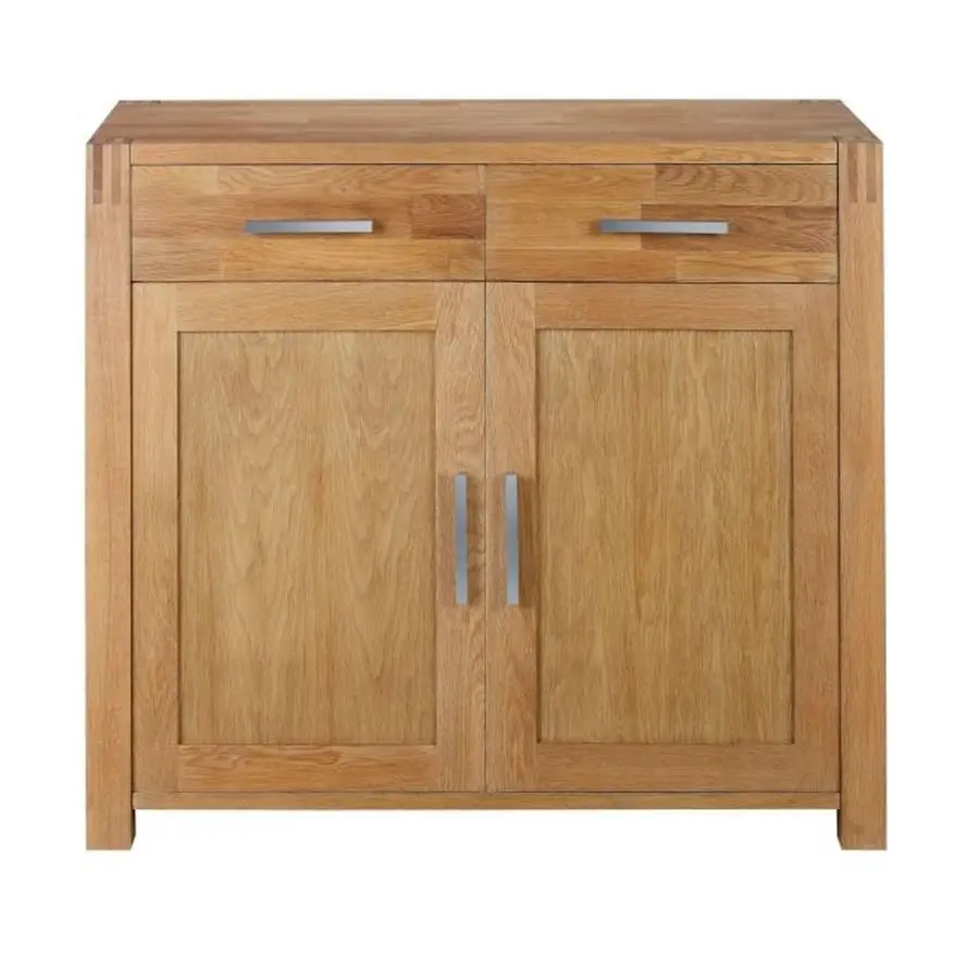 Chest of drawers Chicago New, with two drawers and a larger two-door cabinet. Made of MDF board and finished with natural oak veneer. Shelves of oak veneered plywood. Aluminum handles. Chest of drawers finished by oiling.