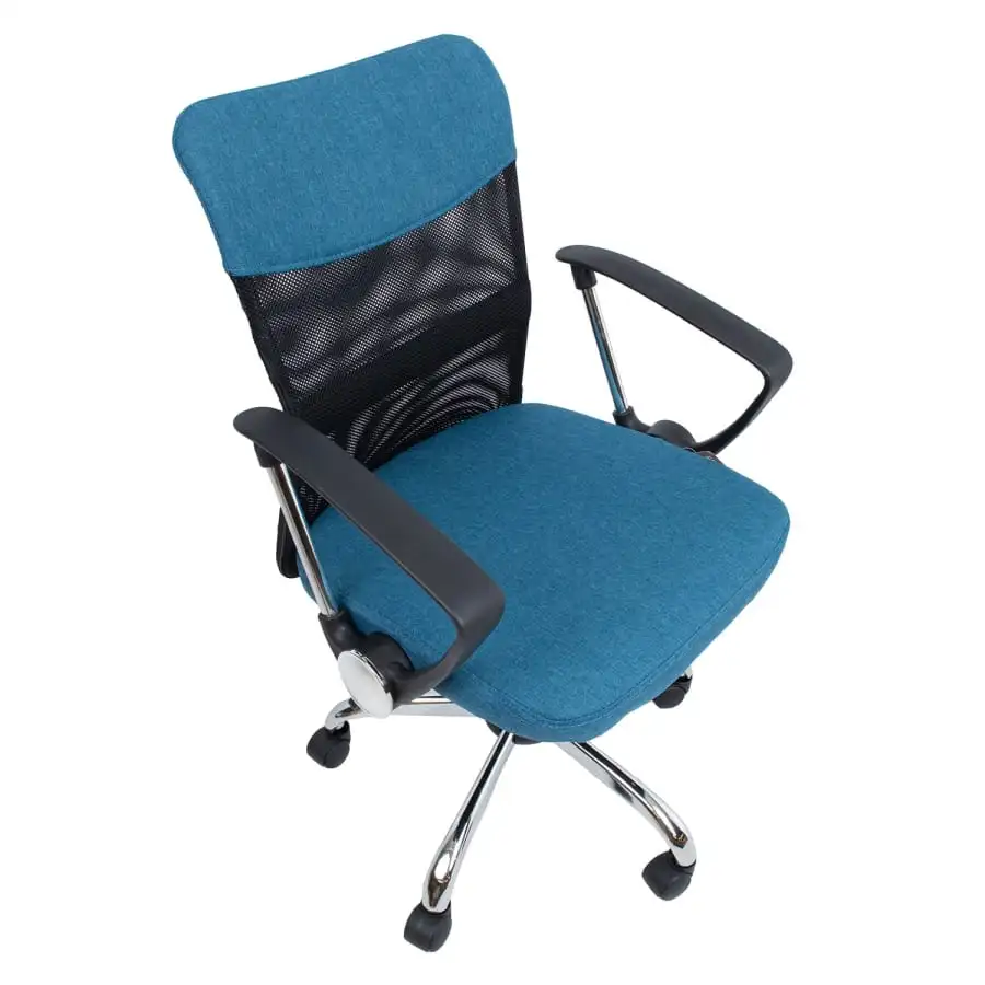 The slightly upholstered seat and the upper part of the backrest are covered with polyester fabric. The center of the backrest is covered with polyester mesh fabric. The tilting mechanism can be locked in one position. Pneumatic seat height adjustment. The armrests are made of plastic and metal. 5-prong metal stand, R30cm. The wheels are plastic, 50 mm.