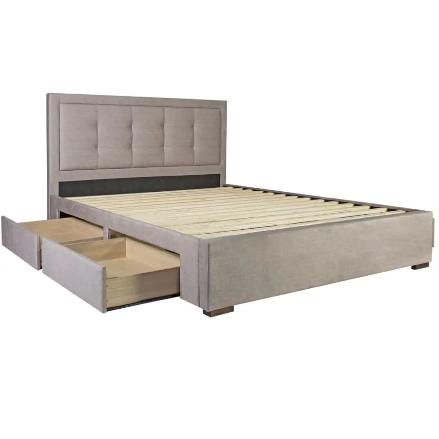 Stylish gray bed Duke 160x200cm. Four lower drawers, offers convenient storage space! The frame of the bed is made of MDF board and upholstered with beige-grey polyester fabric. Legs in brown solid wood. Four drawers inside the frame, two on each side. The drawers slide on metal rails. The slat base is included in the package. The mattress is not included.