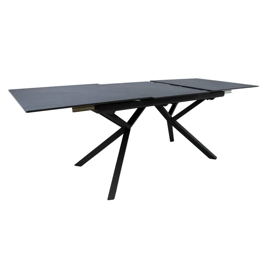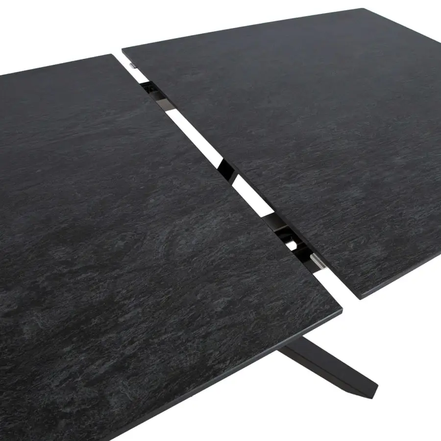Dining table EDDY 160/220x90xH76cm, grey. The table can be extended from the middle. The sides of the table top move on metal rails, the extension piece is placed under the table. The tabletop made of sintered stone is made with an innovative technique that imitates the formation process of natural stone deep in the earth’s crust. Kaolin or porcelain clay particles are processed at a temperature of 1200 degrees, resulting in a material that resembles natural stone in its properties and appearance. The tabletop is thin, but very strong, withstands very high temperatures, does not absorb stains and is very easy to clean and maintain. Since no chemical binders have been used, the material is hygienic. The thickness of the table top is 12 mm. The table has black powder-coated metal legs.