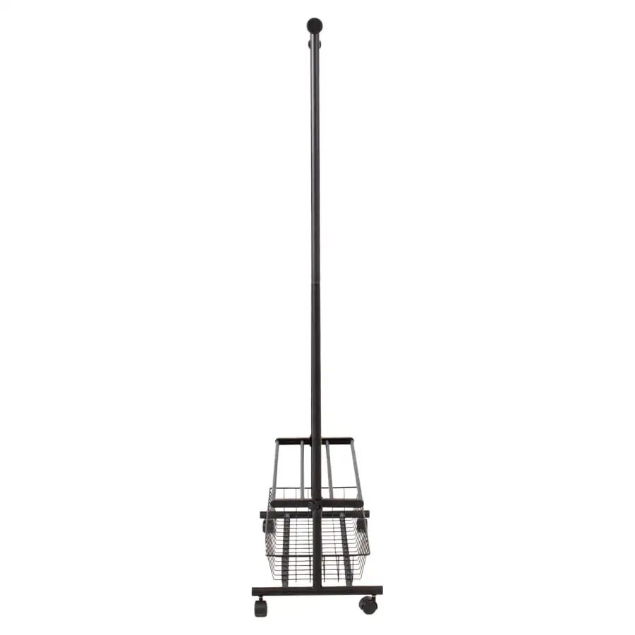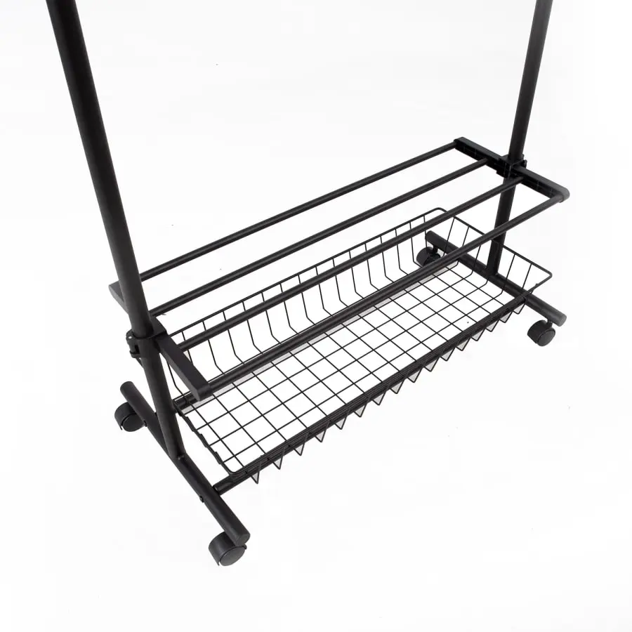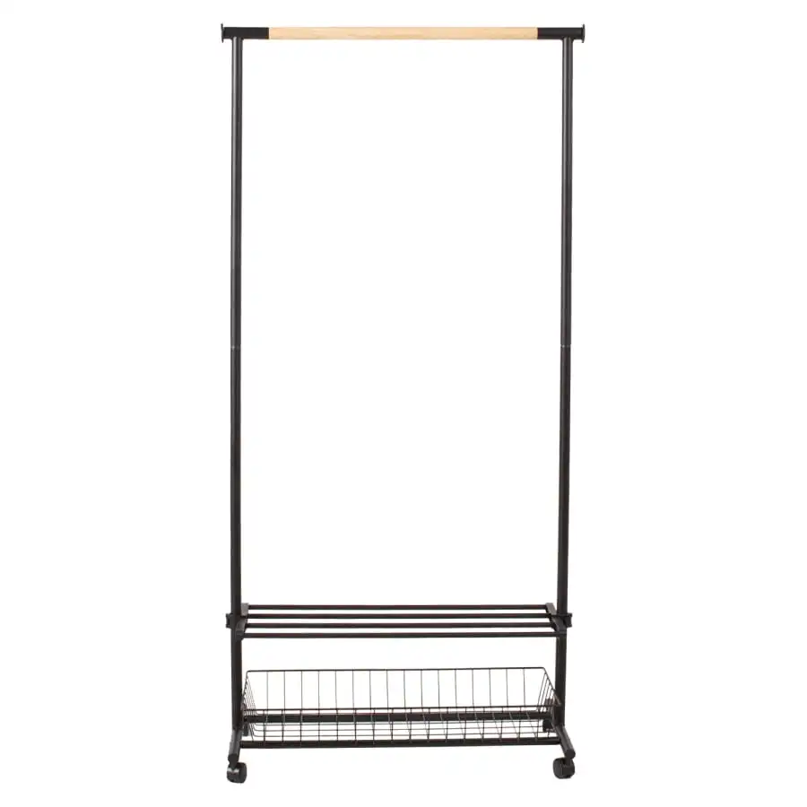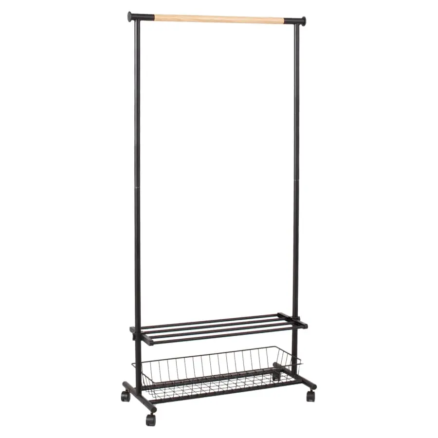 Forest clothes rack with wheels and two shelves. Made of wood and steel.