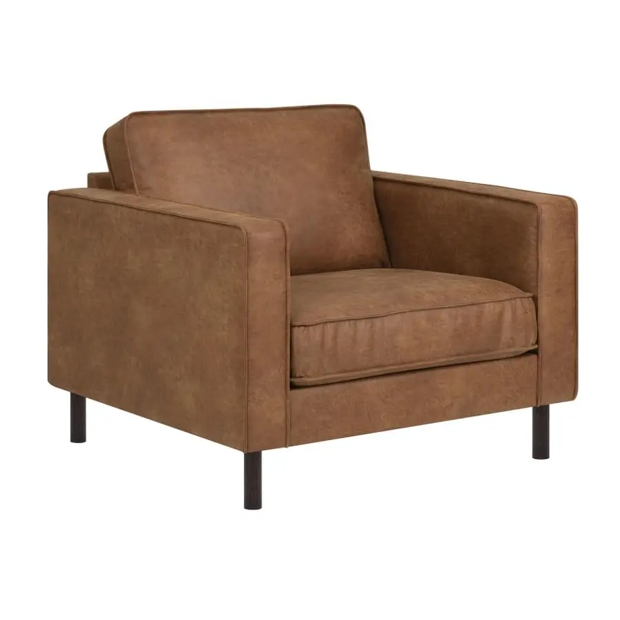 Sittdynan är lossad och kan inte vändas. Kudden är gjord av 120mm 35kg/m3, 20mm 35kg/m3 och 30mm 20kg/m3 skum. Stolen är klädd med limmad läder. Locket är avtagbart. Ryggstödsdynan är lös och vändbar. Den är fylld med polyesterfiber och skum. Fyllningen ligger i ett separat lock. Kuddfodralet är avtagbart. Ramen är gjord av massivt trä, plywood, hårdpapp och spånskiva. Ramen är belagd med 6mm 20kg/m3 skum. Produkten har en sicksackupphängning som är klädd med textil. Produkten har fyra ben av massivt trä. Färgen på benen är mocca. Höjden på benen är 14 cm. Sitsens höjd är 45cm, sitsens bredd är 70cm, sitsens djup är 54cm.