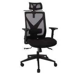 Adjustable office chair Mike. Seat upholstery material: polyester. The backrest and headrest are covered with mesh fabric. The ergonomic backrest is made of black plastic. Mechanism and adjustments: multifunctional mechanism, lockable in four positions. Backrest height adjustable. Adjustable backrest tilt angle. Seat depth adjustable +4.5cm. Seat height adjustable with gas spring. Armrests in black plastic, padded with polyurethane. The height of the armrests is adjustable. Freely tilting headrest, height adjustable. Black plastic leg cross R34cm, 60mm plastic wheels.