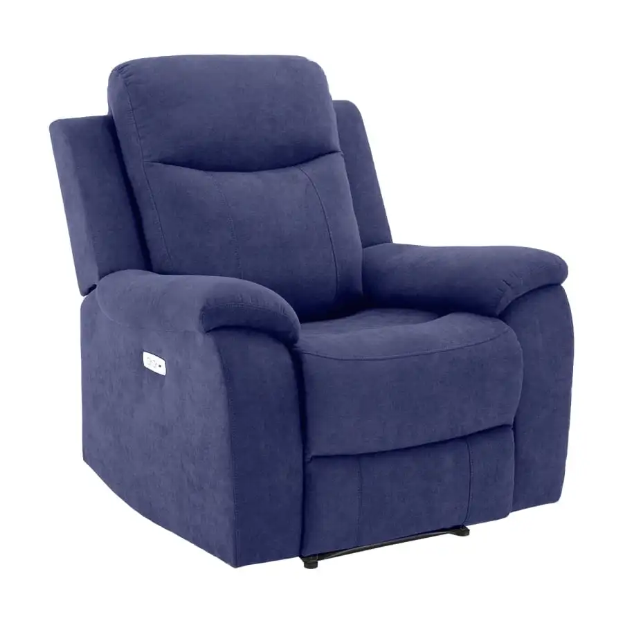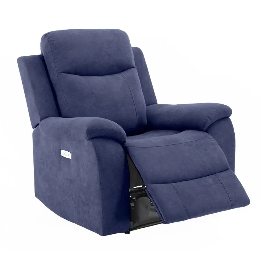 Recliner armchair Milo. The position of the backrest and footrest of the recliner-type armchair can be changed with the help of an electric mechanism. When the footrest rises, the backrest smoothly moves to the reclining position. Frame made of wood, plywood and metal. Polyurethane foam padding and upholstered 100% polyester fabric, 15,000 Martindale.