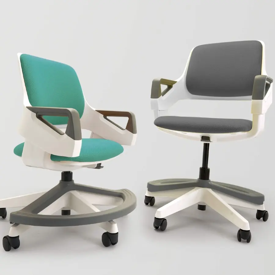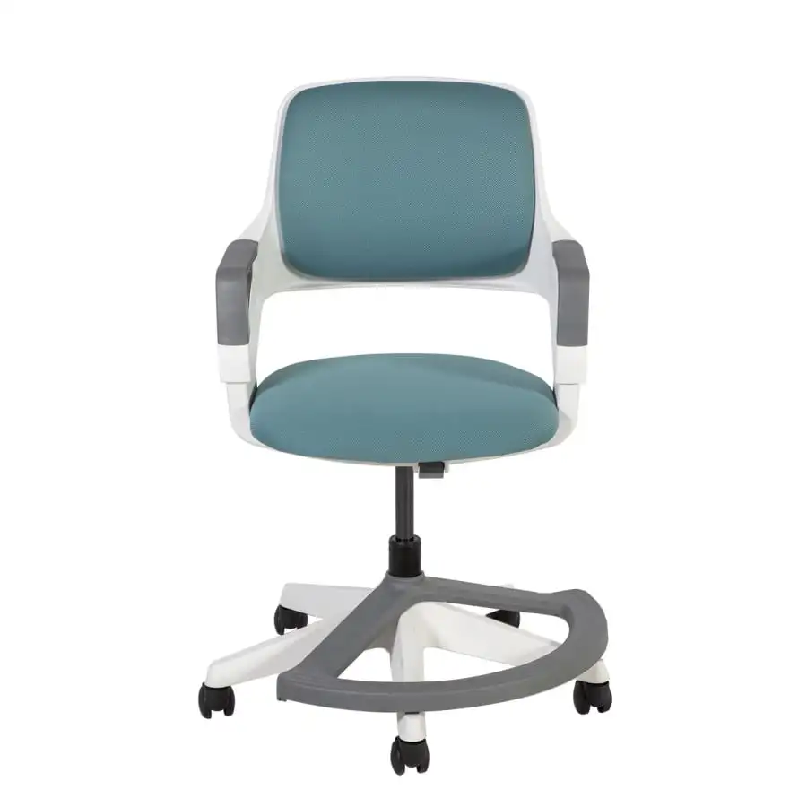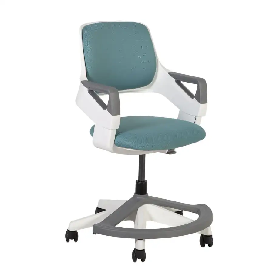 Children’s office chair Rookee for 4-14 year olds. Padded seat and backrest. The children’s chair Rookee is an office chair that grows with the child, whose ergonomics adjust as the child grows. The children’s chair is best used by schoolchildren aged 4-14 (110-116cm tall). The backrest has 7 positions. The height of the back of the chair and the depth of the seat are adjusted according to the height of the child. The height of the armrests rises automatically when the backrest is moved backwards and upwards. The swivel footrest provides comfort for children of all ages. The frame of the chair, the armrests, the leg cross and the footrest are made of injection-molded plastic (PP 100% recyclable). The height of the seat is adjustable with a gas spring 38-50cm. Backrest height adjustable 38-43cm.