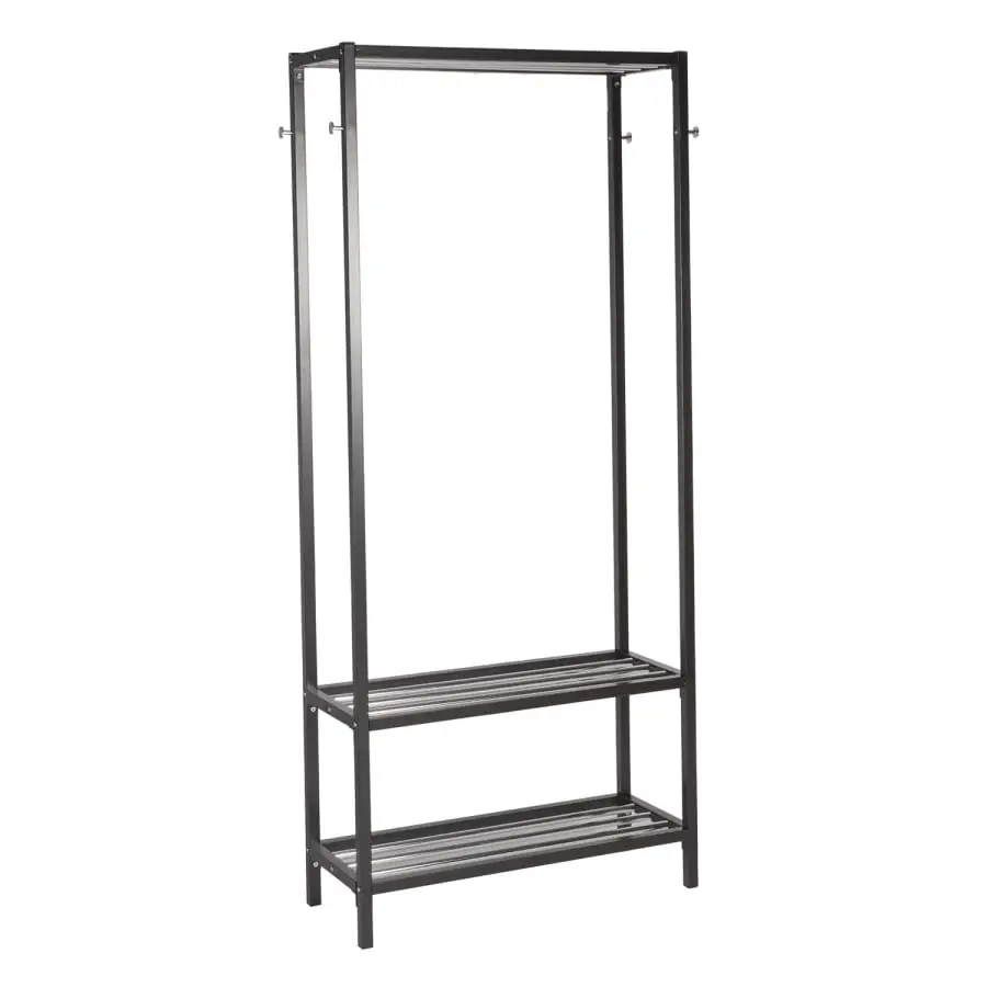 Vestibulhängaren Straight är gjord av stål. Praktiska klädställ på sidorna och två skohyllor.