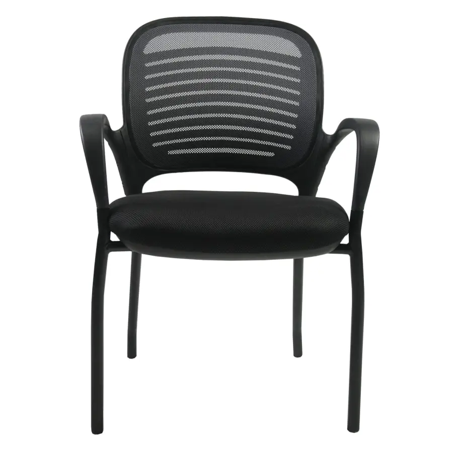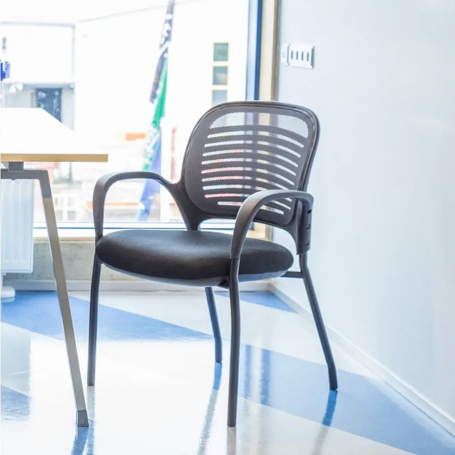 The Torino metal frame customer chair seat is upholstered in durable polyester mesh fabric, 30,000 Martindale. Armrests made of plastic. The chairs are stackable.