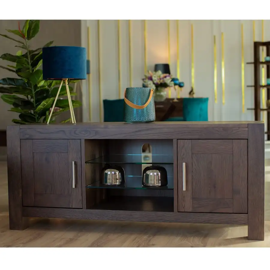 Tv-bänk med två luckor och två glashyllor i mitten. Tillverkad av ek och avslutad med olja.