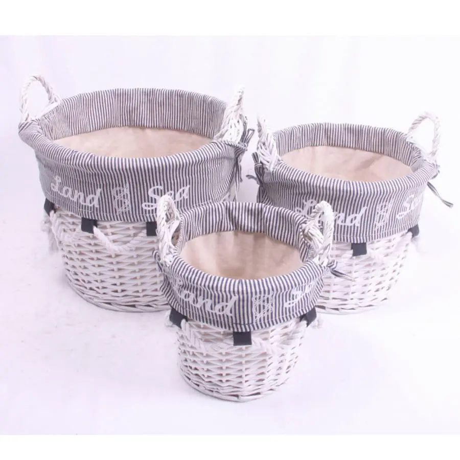 Round basket WILLI SEA, S: D23xH22cm, white. Basket material: hand-woven natural willow, color: white, textile lining: blue-striped cotton with rope. Text: Land&Sea.
