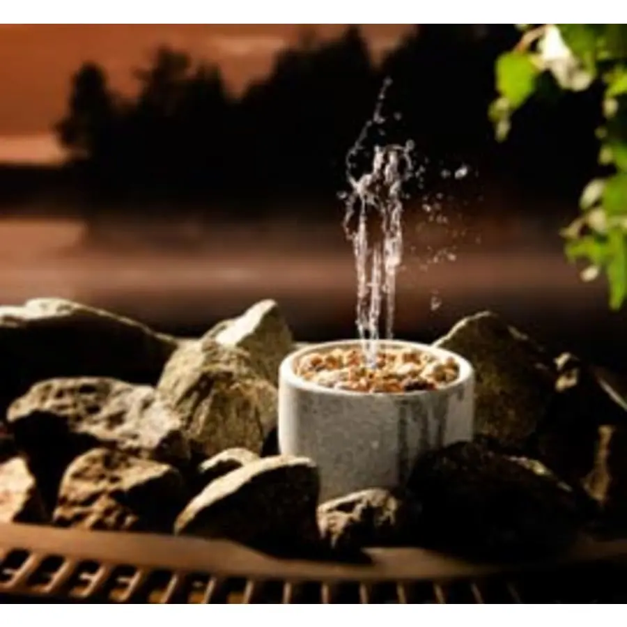 Saunatroikka is an impressive fountain for your sauna stove. First, its beautiful, reddish stones give off soft steam, creating the perfect sauna atmosphere, soon followed by three water pillars rising from the fountain pipe, rippling and burbling above the sauna stove. You can use the sauna fragrance of your choice with the Saunatroikka, enabling the fountain to spread pleasant aromas inside your sauna.