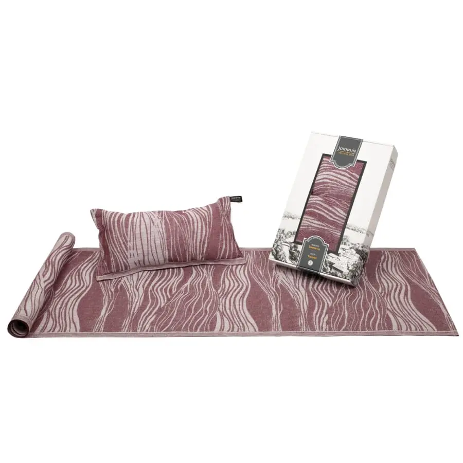 Setet innehåller en plommonfärgad Virta-duk och en Virta-kudde. Duken är 45×160 cm, bastukudden 22×40 cm. Sammansättning 50% lin och 50% bomull.