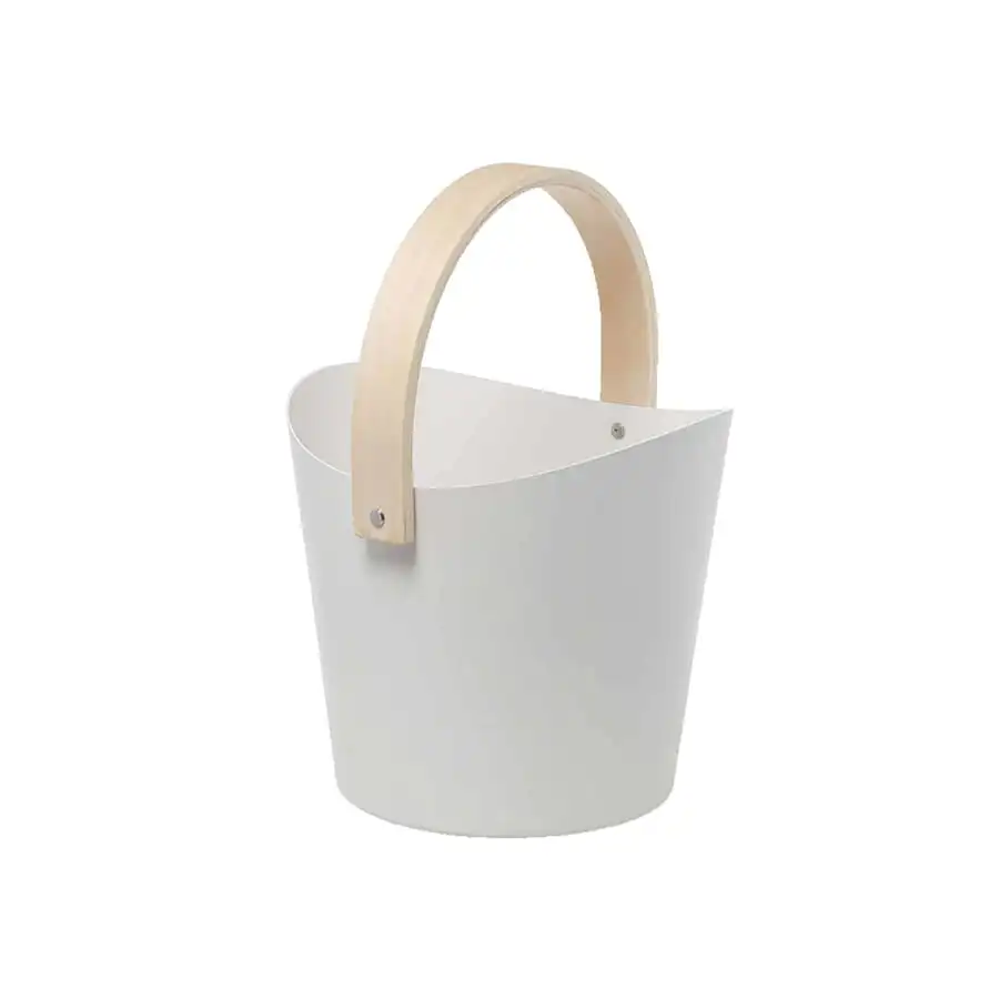 Den snygga bastuhinken Opa LUMO i skandinavisk stil är gjord av aluminium och har vit finish. Det vackert enkla pannbandet är böjd björkplywood. Höjden på hinken är 24 cm och diametern är 26 cm.