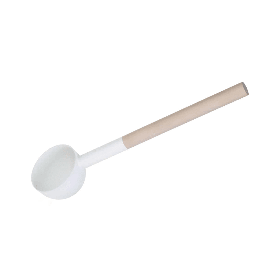 The stylish, Scandinavian-style Opa LUMO ladle complements the sauna bucket of the same series. The bucket is made of aluminum and is finished in white. The handle is birch. The capacity of the ladle is 4 dl, the length of the handle is 33 cm and the total length of the ladle is 43 cm.