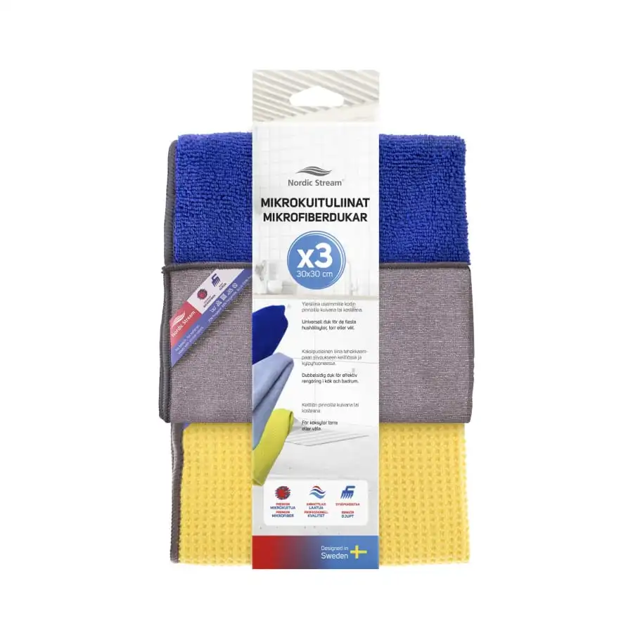 Förpackningen innehåller tre olika rengöringsdukar i mikrofiber. Storleken på dukarna är 30×30 cm.
