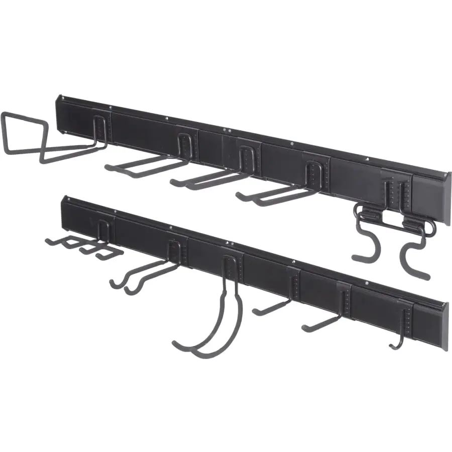 Two 61 cm long rails that can be attached to each other or separately. The set includes 13 different hooks that can be placed on the rail as desired. Total load max. 100 kg / rail, 20 kg for one hook. GS accepted. Material: steel. Color: black.