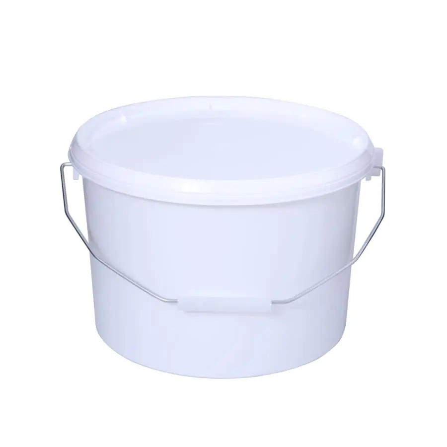 Plastopak 10 liter white storage bucket with lid. A metal headband on the handle. The food is suitable for use and dishwasher safe.